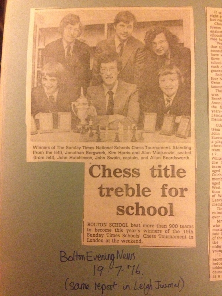 One of my oddest false memories is when we returned by train from London having won the Sunday Times National Schools championship. Bolton School won it once, in the 1960s, and again, in 1976, when I played bottom board (by 1979, I was top board, and Nigel Short – Wikipedia, the free encyclopedia was by board 2, although about that time he started to surpass me.