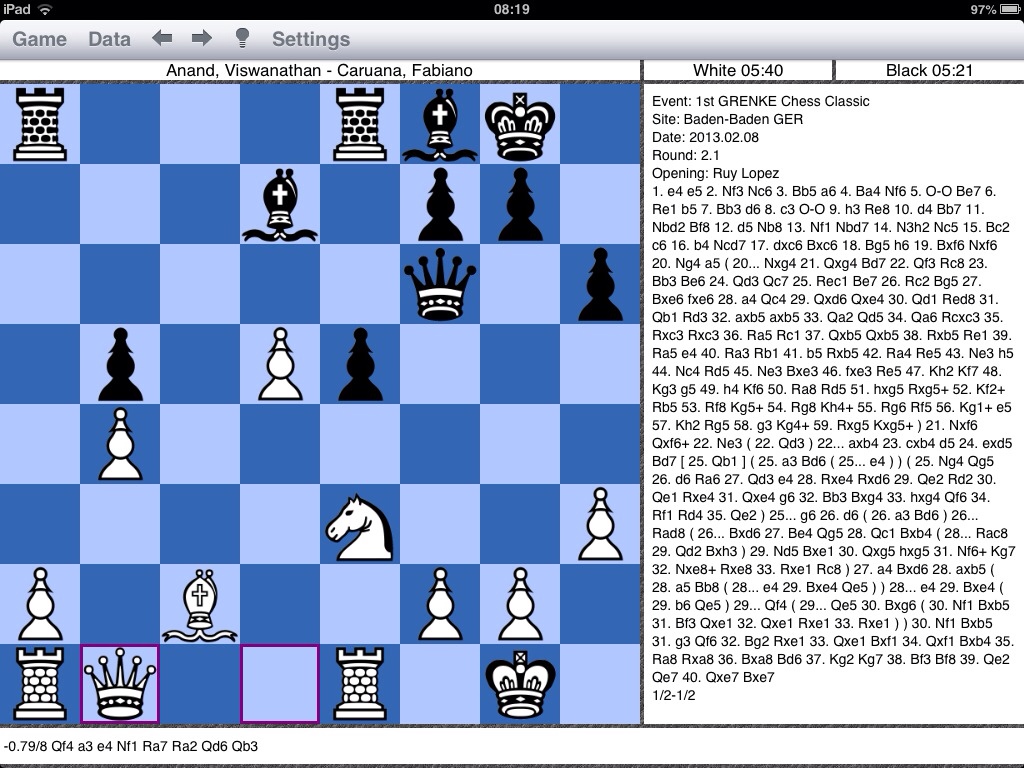 Here in Baden-Baden Vladimir is accompanying Fabiano, and a repetition of the Wijk aan Zee scenario doesn’t seem to be on the cards. For the second day in a row Caruana demonstrated deep preparation and surprised the World Champion with 20…a5!?, a move Vladimir had recommended the night before instead of the previous grandmaster choice of 20…Nxg4. Vishy at first continued to play relatively quickly, but he lived to regret it – lamenting his “careless” 22.Ne3, which allowed Caruana to equalise with 23…d5! (Anand in the press conference: “I should have at least thought about this”)