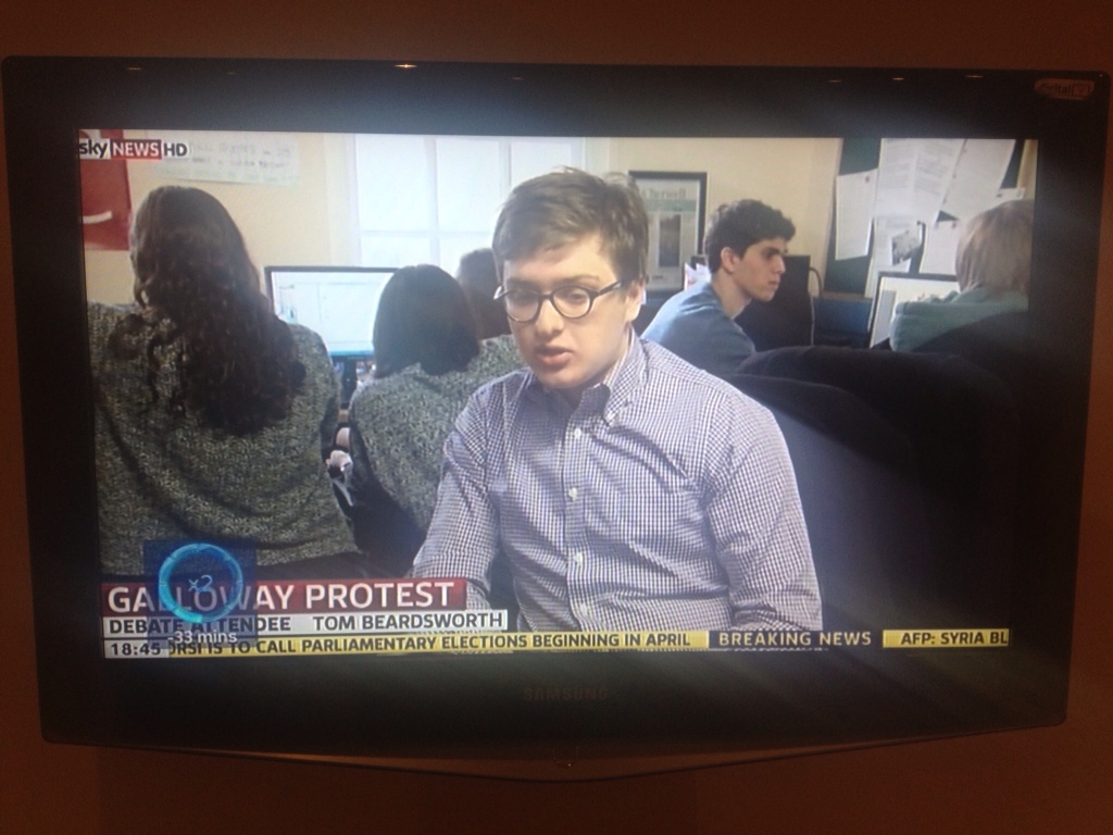 Last week, he was, true to his journo self, in the front row when George Galloway refused to talk to an Israeli student. Tom wrote an article for Cherwell.org that evening http://www.tinyurl.com/a2nc9bo which Sky News picked up (as did all the papers)…resulting in them coming to Oxford to interview both the student and Tom http://tinyurl.com/azz3vte