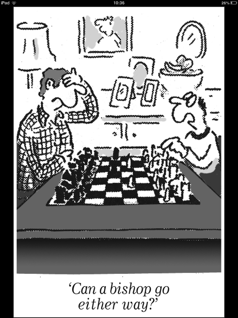 Today's paper shows a dozen of the best. Below I show the two of the twelve which are on….chess. The first cartoon though is yesterday's cartoon.One regret (in my long list of regrets (1)) is that I wish I had taken copies of many of them, since so many were just perfect for what I was thinking or feeling, or what was otherwise current, at the time.