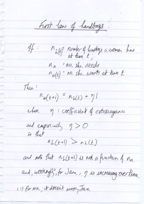 This, and the newspaper article which caused my next post, started me thinking ’how many handbags does a woman need'? I am delighted to have solved this, and below is the mathematical equation.