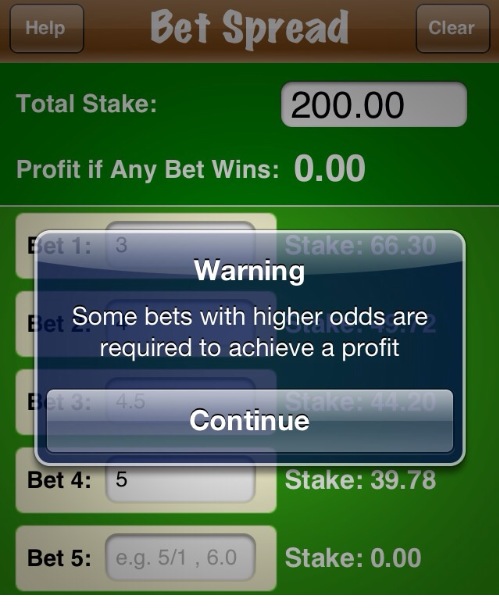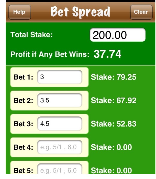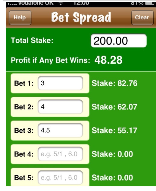 If you were sure that one of Bobs Worth, Sir Des Champs or Silvaniaco Contini would win (but not sure which one, and not caring which one) it was possible to back each of them, in appropriate proportions, and have a guaranteed return. This is called ‘Dutching’, and is not always possible, but sometimes is, and when I saw the odds being offered (not that I bet, I am just interested in the maths and my client) I intuitively knew this race was Dutchable, and indeed it was, as the screenshots below from the Bet Spread app show.