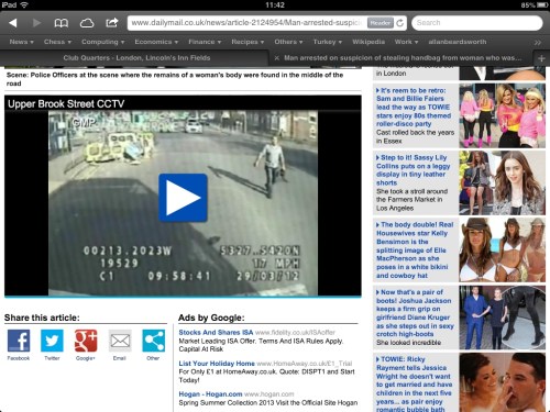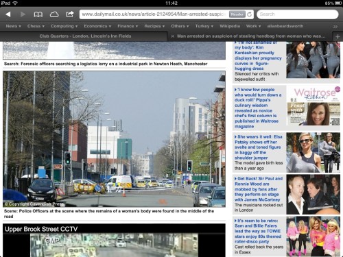 Early evening: left the office, driving on Upper Brook Street, and I can see ahead that the road is closed, cordoned off. Could it be what I saw in the morning? No, but called Jane, she checked the Internet, and…woman's body found on Upper Brook Street. Checked my car voicemail, and the police had been trying to call me; so rang them back, reported what I saw, and wrote a witness statement.