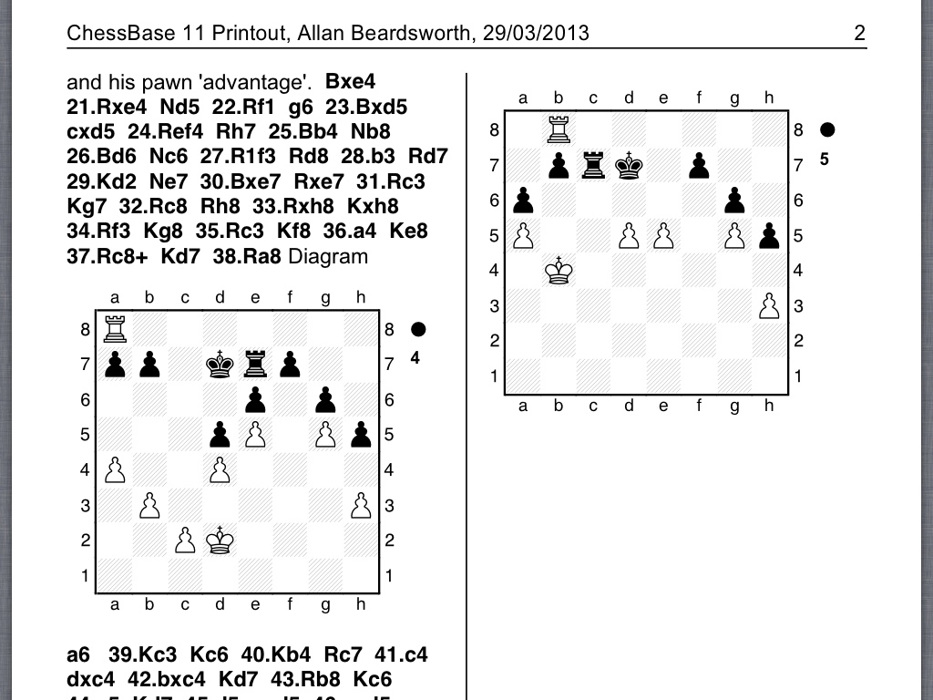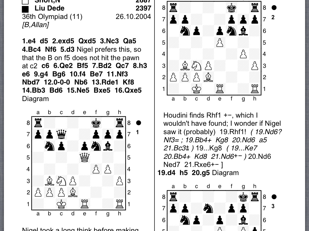 However, it was Nigel's 16th move, and his comment that after exchange of queens he is effectively a pawn up on the king side, which struck me. Furthermore, he told me such consequences were common in Caro Kann systems: since he told me that, I have seen its truth numerous times. This is for me a clear example of the insight of such a great player as Nigel. The top right diagram shows it best, with 3 v 4 pawns.