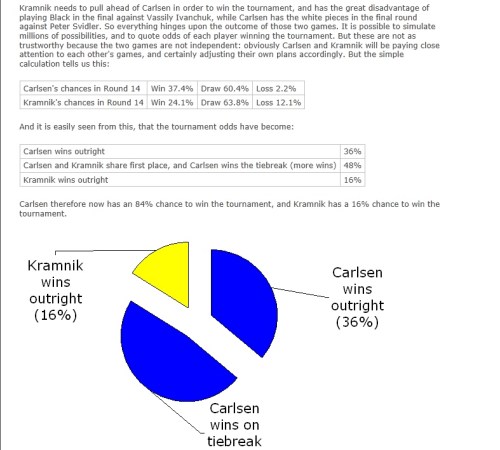 I didn't check these figures, knowing (giving their source) they would be right, but did sense check Kramnik's chance of winning: 24.1% of him winning multiplied by Carlsen's chances of drawing or losing, plus 63.8% chance of him winning, times Carlsen's remote (2.2%) chance of losing.