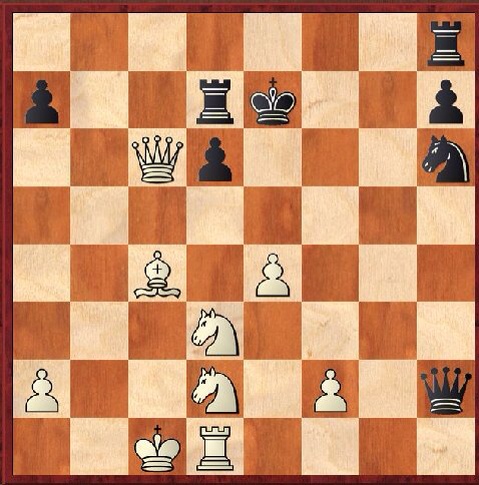 This ranks as the worst puzzle so far. Better would be to make the question ‘find a reasonably sensible move which doesn’t win’. Cordingley’s solution is 1 Be6, and then long variations, but my instinctive first move was 1e5!, just based on general principles of opening lines. I think I would have played it without calculating much, partly because there is no need to calculate hard: black has many responses at each time, so why waste energy? Instead, just open the e file, also open the Qc6 path to e6, and also note that LPDO (John Nunn’s loose pieces drop off) applies to the Rh8, if white can play Qf6+ check. Houdini confirms 1 e5 is indeed best, with a phenomenal plus; and also likes the equally sensible Re1 and Nf3, ranking each of these as similar to Be6.