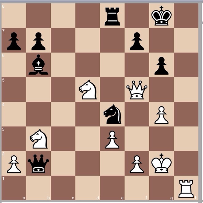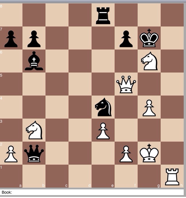 The move to dispense with first is 1…Re7, biffing the knight, and that loses fairly straightforwardly to 2 Qc7+ Kg7 3 Qh8+, skewering the king and queen, which being LPDO, is biffed. Somewhat harder are the two king moves. Against 1.. Kg7, simply biffing the knight, 2 Qe4 wins, since there is a threat of a discovered check, and the Re8 is biffed. I found it hard, and failed to, properly compute 1…Kf8, but could see that it was strong, and would have played the right moved and taken a fresh look when the difficult position came up. 2 Ng6+ Kg7 and I don't know if in practice I would have found the follow up.