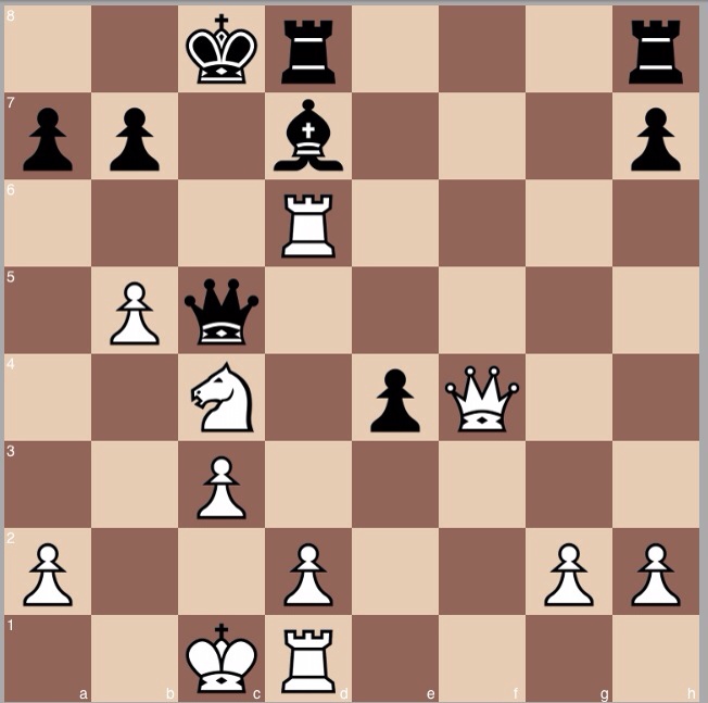 Since I am dealing with a puzzle book, I look for convincing wins. A simple pawn count, and a check that the knight isn't hanging, quickly convinced me that there was a prosaic win, and checking with Stockfish confirms that the simple 1 Qe4 doesn't hang anything, and has a winning advantage; and the slightly cuter 1Rd4 also protects the b5 pawn (because Bb5 would lead to Nd6+, winning the exchange, and there is no perpetual or worse for black). But neither of these moves would merit inclusion by Cordingley, so I had to look elsewhere: and clearly it had to be the black squares, and in particular the h2-b8 diagonal, and in particular c7…