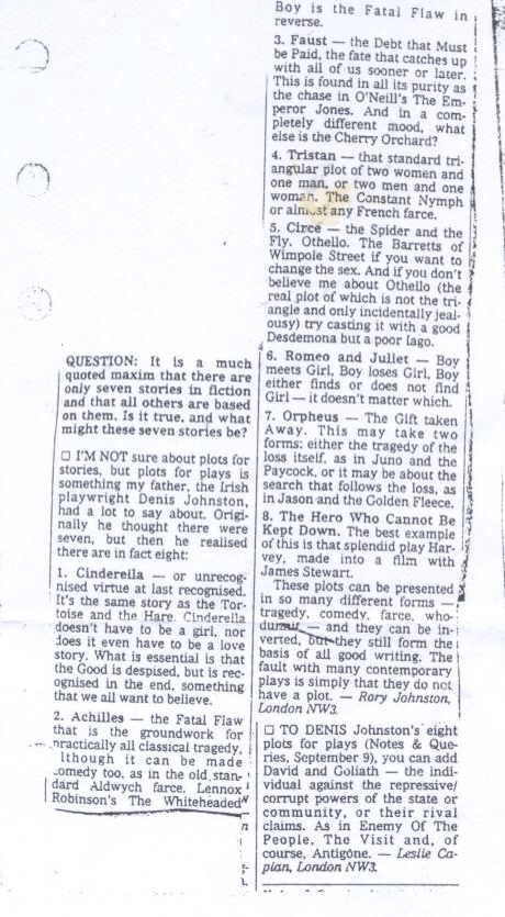 I recently suggested to a friend that she tries to write a short story or other piece; she has a way with words, but her normal writing is for business. I did recall at the time keeping a clipping about the different bases for stories, but has no idea where it was.