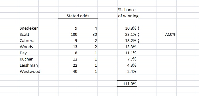 The question I received was about Dutching as a betting strategy. If you understand that I hardly if ever bet, hardly if ever watch sport, and just like maths, then my answer is 'don't apply it as a strategy'. The spreadsheet below, of Betfred's odds a few hours before the final round, shows that the bookies are laying their bets on a 110% outcome: so that the top three, have a less than 72% chance of winning.