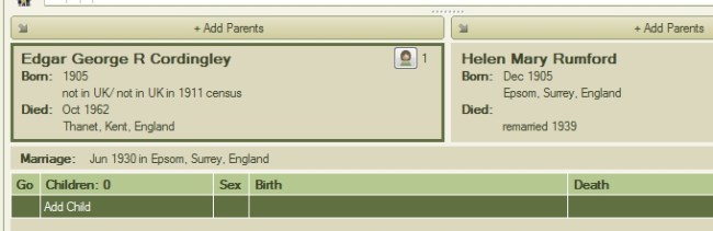 One of my other hobbies is family history, and through some of the programs I have, and websites I subscribe to, I decided to find out something about EGR Cordingley: little seems to be available through google. I had hoped to find that he had a child or grandchild who was alive, whom I could contact, to let them know about the project, on the off chance (perhaps very off chance) that they would be interested in chess.