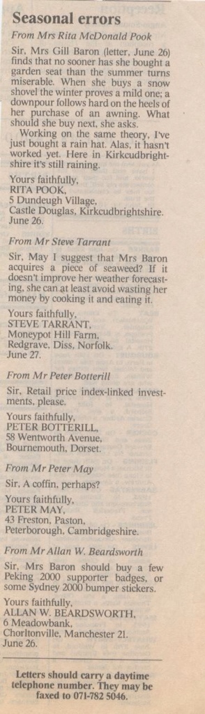 For more years than I can remember, I have read the letters to the editor in the Daily Telegraph. Never all of them, never even most of them, but often just the humorous ones and especially those in the bottom right hand corner…that's the place to be.