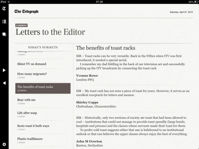 Recently the Telegraph letter page has been having a 'theme' about toast and toast racks. Two extracts below (the series ran on for several days).
