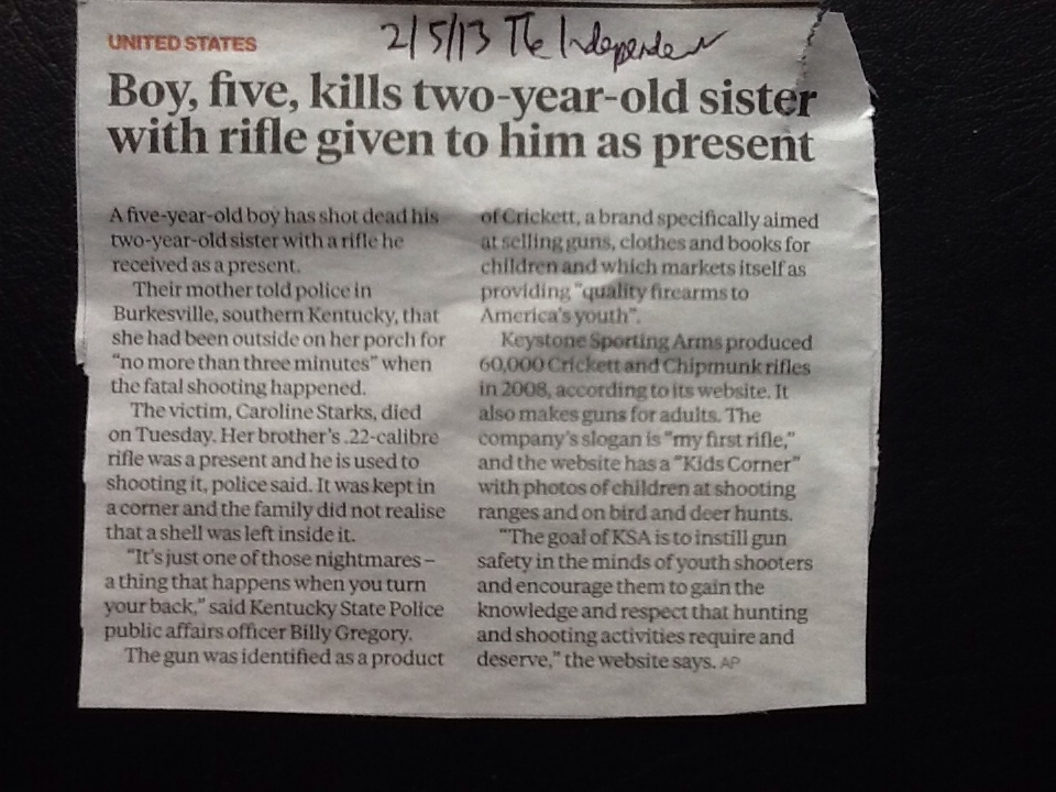 Were we stunned by the policeman's 'shrug off the shoulders' comment, that it is just something that happens? Or of 'my first rifle' or 'kid's corner'? No, alas, we weren't.