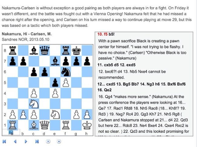 My 'move of the day' (which could have gone to Vishy's 35 Be6!!) goes instead to Magnus Carlsen's 10…b5, with the prize 'most humiliating or humbling move' because both Naka and Magnus thought the move as being nothing special whereas to me, it is a move which I wouldn't have even thought of. In fact, I also liked Magnus's whole way of defending against the Vienna: a quick Na5, hitting and exchanging the bishop, and then the c6-b5-d5! sacrifice to control the centre. Noteworthy. (PS- I wonder if I am right in thinking that Magnus has a preference for the two bishops?- it is the impression that I have gained, watching his games).
