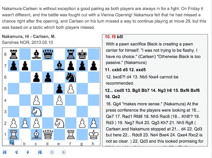 The fact that both players felt it was forced I find very insightful. When I saw the move live, I assumed that after 11 cb black would recapture, and then we would have a type of Sicilian: my thinking being 12 Bg5, exchange off the Nf6, and NvB, control of d5 struggle. But no, Magnus sacrificed instead, and, once he had played these moves, they were 'obvious'…which to me means they weren't obvious at all.