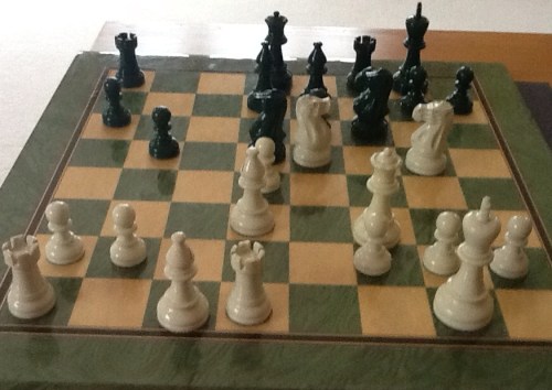 Since it s number 50, the position is in FEN notation in my Cordingley book (as a recap, every fifth puzzle is in FEN, to save wartime paper). So I had to set it up on my board, and chose to set it up on me of my favourite chess sets, the one Jane bought me for my fortieth: