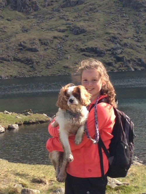Charlie, our Cavalier King Charles spaniel, with my younger daughter at Angle Tarn.