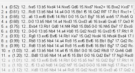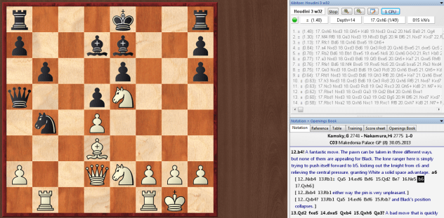 When I put the position into Houdini, it wasn't his first choice for a few seconds, but then after not too long, the engine's preferences change, to make 12 b4 clear first choice. It is also interesting to see where the move I would principally look at as my reply as black, 12…Nb4, comes in its evaluation: