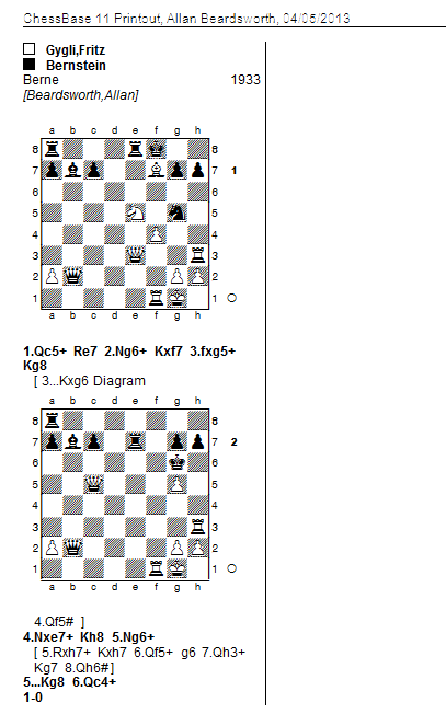 I enjoyed solving this puzzle, which, for a change, leads to a decisive result. My first try was 1 Nd7+ Kf7 2 fg+ when I think either 2…Kg8 or even 2…Kg6 (3 Qd3+ Be4) are sufficient, at least for the game to go on, because of black's threat of mate on g2. So I had to find something better.