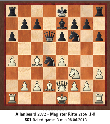 I know blitz counts for nothing, but when it is nice, it is very nice. Today I felt I was in a slight mess, playing white against a Scandanavian defence (a slight variant, 1…Nc6, 2 ..Nf6. 3…d5) and in the position below, I had felt I was beginning to struggle.
