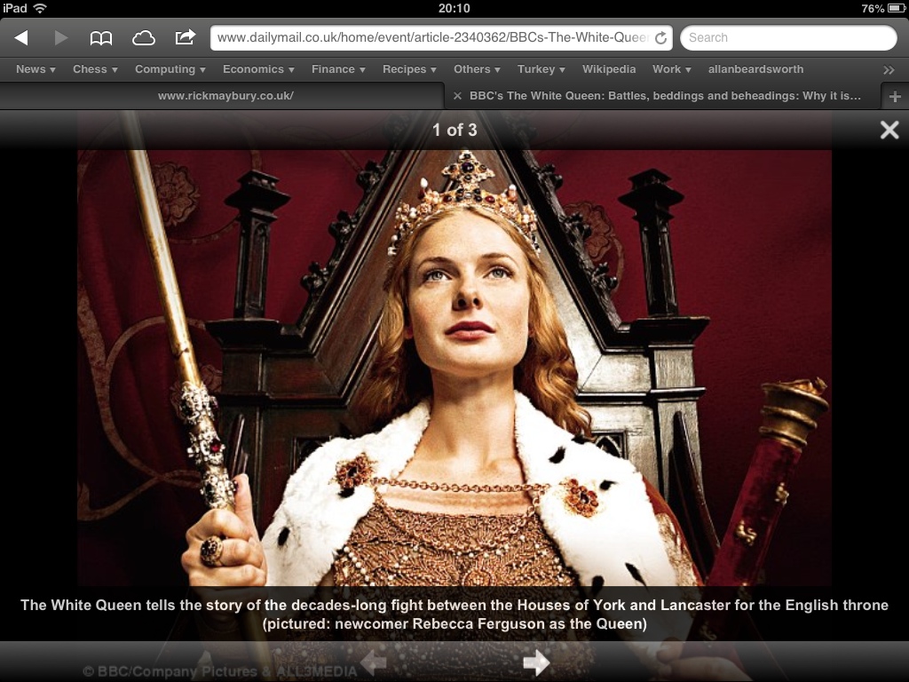 Last night, Jane and I watched the first episode of the new BBC1 series, the White Queen. We really enjoyed it, and whilst I know it isn't (and doesn't claim to be) historically accurate, I look forward to gaining some understanding of the Wars of the Roses; I have already started my googling and Wikipedia searches.