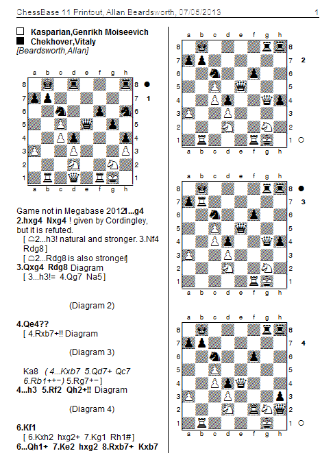 I was surprised when I looked at Cordingley's solution, to learn that 2…Ng4, he says !, was played, and won. I felt it was a flashier-than-necessary approach. When keying the game (which is not in Megabase) into Chessbase, and checking with Houdini, I found that 2…Ng4 is in fact ?, flawed, by the wonderful 4 Rb7+!!. Who knows what the time factor was, because Rb7 is somewhat obvious- when I checked my 2…h3, I looked at how fast white's counter play was, with both 3 Rb7+ and 3 Qa4- not fast enough, but at least the concept of Rb7+ was in my head, and it comes with massive power once the R has move from d8, and the Queen can go to d7 from g4: examine all checks, examine all smites, as CJS Purdy says.