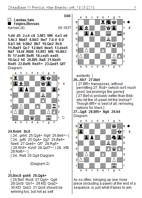 A calculation exercise: not easy, not hard. The first move is obvious, and then it is a question of defeating each of black's defences, with the move played in the game the one which provides most resistance: but it is fairly straightforward calculating if not to the end, then as far as necessary: i.e. to a position where white clearly has plenty and probably overwhelming advantage.