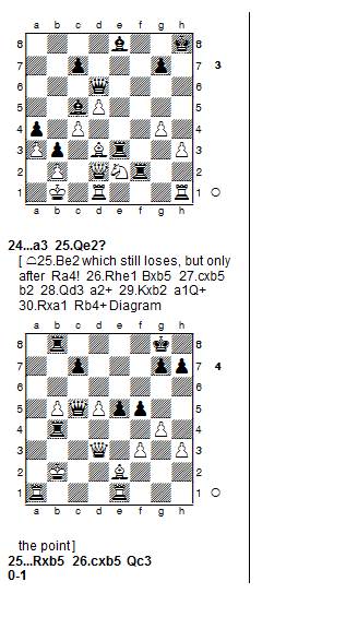 Firstly, of course, I tried to make 1..Qa3 work, but couldn't: I thought black needed just a bit more. Alas, I found a way, 1….e4, which was the right idea, but my execution of the follow up was inaccurate: I thought getting the Rf8 to f2 would be the necessary extra, but it isn't, and its activity is counterbalanced by white's greater luft, including Qd3. Houdini showed me the way, after it had quite a considerable amount of time to think: start with 1…e4, but use it to gain a tempo with Rae8, smiting the Be4: very instructive. Houdini also favours black after 1…Rae8 and also (somewhat) 1…Qe7: the former in particular improves one piece, whilst threatening to push the e4 pawn.