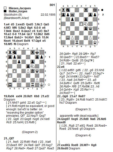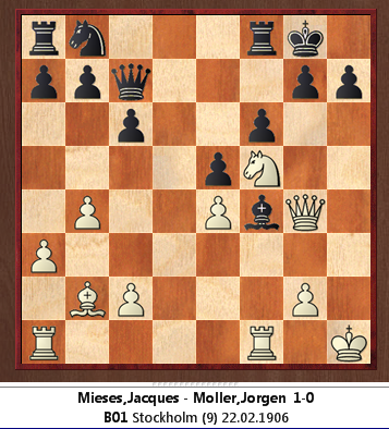 I switched on Houdini and it showed me that the line to 3 e5 was played. Very instructively, it later shows that Mieses threw away his advantage, but that black did not capitalise on it: I wonder if Mieses ever knew that ef!! was far stronger than pushing the pawn forward: of course, I didn't find ef!!, Houdini did, and it took me a while, assisted by the engine, to see its full effects. It is quite telling how much can be made by a less in development: it shows that a sense of urgency is paramount, and also that precision is required.