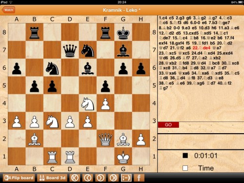 Leko. I was so puzzled that, rather than switch on an engine, I took several screen shots, and studied the position on the board. Still mystified, I have checked on Chessbase to see what they said, and, as I thought might be the case, Kramnik's combination was out of distress, not out of choice, and Peter was bluffed by not taking it.