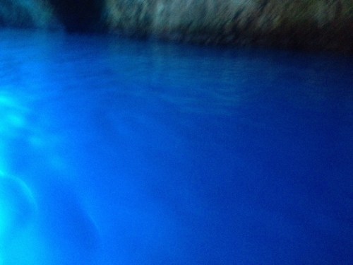 To the extreme left, there is some highlighting. I cannot remember where the boat was when I took the pictures- the captain kept moving the boat around, quite quickly, but I know that we weren't near the entrance: I am guessing, but I suspect the highlighting is because there will be other holes, not discernible to the tourist's eye, perhaps just cracks, perhaps just below the water line, which cause this underwater lighting effect. On the boat trip back, I stared a lot at the rocks, and think they are virtually all limestone: so probably porous, possibly cracked, and this helped me in my thinking about blueness.