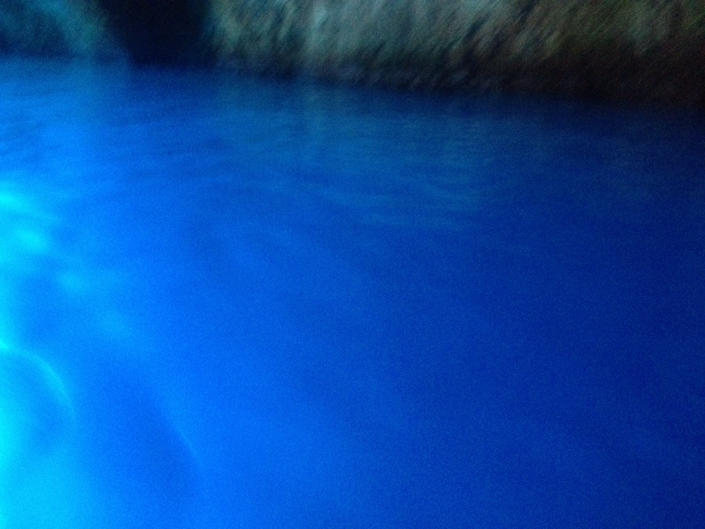 The last element is the wall and ceiling– which, alas, I didn't look at, or focus on, for the few minutes we were in the cave. The shape of the wall will affect the effect. At the extreme, if the back wall was plain and vertical, then the effect would be lessened. Here, the cave's wall must be sloped, giving the light several occasions to reflect and refract, and the greater the number of refractions, the water will appear bluer.