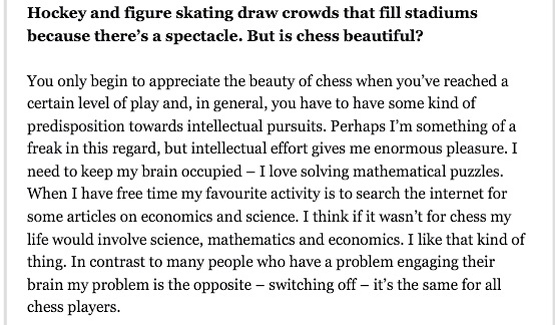 Secondly, his comments on can chess be beautiful – yes, incredibly so, once you reach a sufficient level- I find beauty and joy all the time in chess- and on how he relaxes. I think I am very like him- I switch off by thinking about precisely the same things.