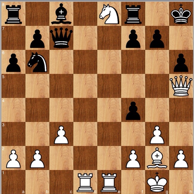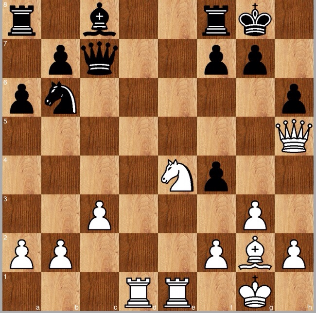 Back's queen is in a net, and its only safe move is 1…Qc4, since 1…Qb8 drop one of the two LPDOs (Nb6 and Rf8) by 2 Qc5. (The third black LPDO comes in a later variation).