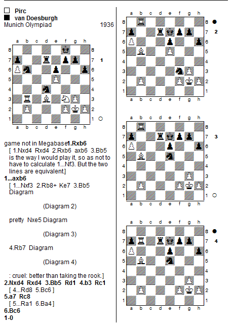 Somehow, on this page of the book, there were several easy enough puzzles. Here, the motif is self evident: sac on b6, and promote: using the B to deflect or prevent the R from defending. White can win in two essentially similar ways: 1 Rb6, as played, or 1 Nd4, as I preferred: they are more or less equivalent, save that 1 Rb6 gives more for white to calculate.