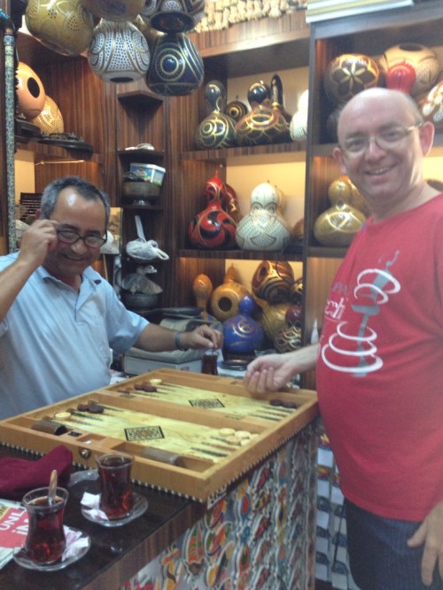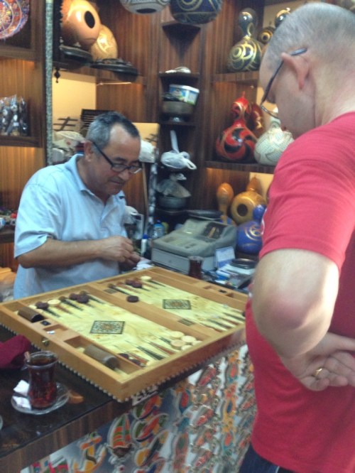 Today, I had a particularly successful negotiation: a price agreed for the plates we she wanted, and then a negotiation about cash or credit card, and could he throw in a beautiful backgammon set as well [ I have one client, just one client, born in this region of the world, who haggles in this way: we agree a fee, them he renegotiates it: so why can't I learn from him?]. Surprisingly, it wasn't too tough to get an agreement: the shop owner loves backgammon and when I told him I did too, he accepted a sizeable price adjustment if I were to have a game with him. He offered us glasses of Turkish tea, and battle began.
