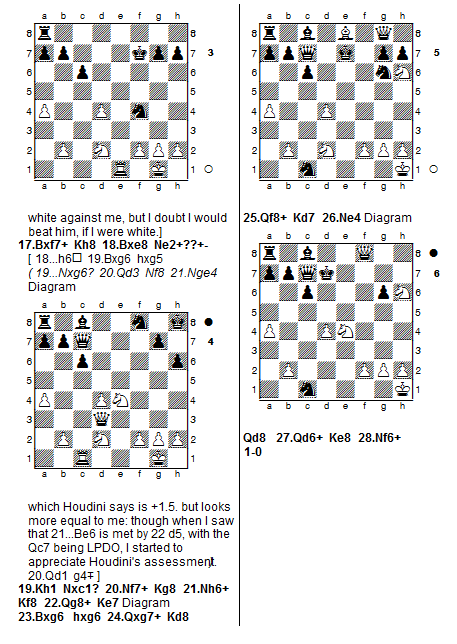 The reason why 1 Nf7! is very strong is too deep for me: by which I mean I could not see how trussed up black is after the main line 1…Rf7 2 Re8+ Nf8 3 Qb4 Ng6 4 Ne4; which once you see it, and spend time on it, can be seen to be really strong; I could also not readily see why 3 Qb4! is so much better than 3 Qa3, but it is, partly since 3…c5 isn't a threat.