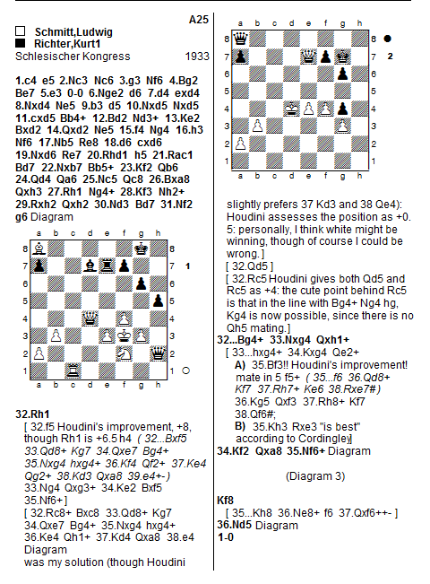 The move I chose, very quickly, was 1 Rc8+. I was able to calculate the line deeply, and assessed the Q+P ending as winning, but Houdini tells me white is only somewhat better. I don't know: what I do know is that 1 Rh1 is far better, as are each of Houdini's 1 f5!!, 1 Qd5, 1 Rc5! (exclamation marks partly for originality).