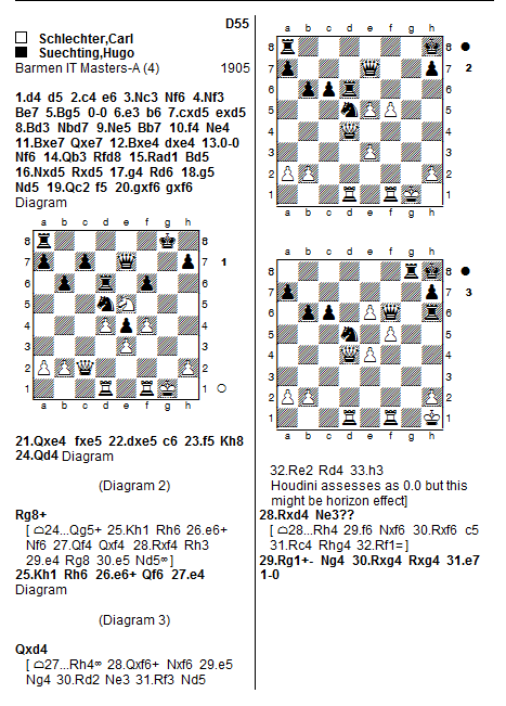 This may be the result of the horizon effect, or show the difference between silicon calculation and carbon emotion. The phalanx of advancing e and f pawns would frighten most blacks, their hope being to sacrifice the knight for one or better still two of them. Houdini shows the way, by actively improving the queen (Qg5+) and creating counter threats (Rh6): instructive, as ever.