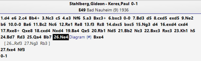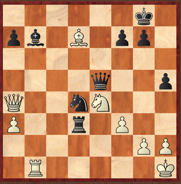 Before I checked with Houdini, I thought that I messed this one up. Yes, I found a nice way to win, 1…Rf3!, when 2 gf Nf3 is carnage, if he wanted, white could struggle on with 2 Ng3 and it is messy, though 2…Rb3 keeps everything under control. Far simpler, if you can see it (and I couldn't) is 1…Be4! 2 gf Nf3!!, the point of which I failed to see at first, but is 3 gf Rd2 mating. However, Houdini actually prefers 1…Rf3 (-16) to 1…Be4 (-12) although of course both assessments are so high so that the comparison is meaningless: it suggests white can grovel on by 2 Qa7 after 1…Be4.