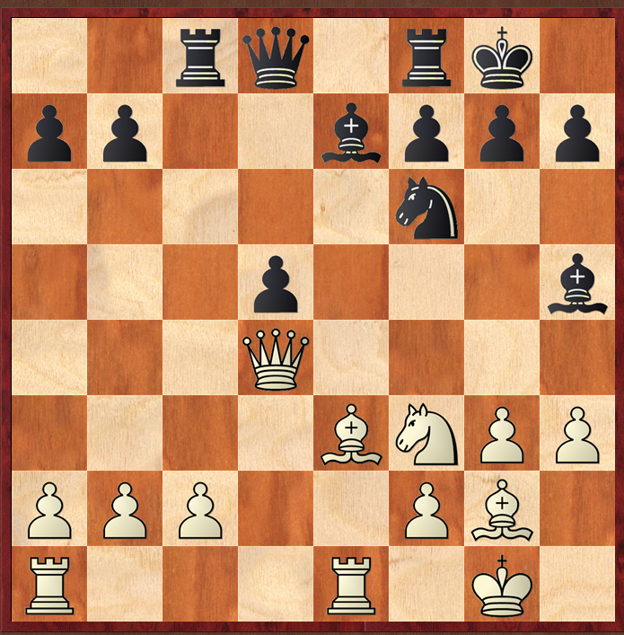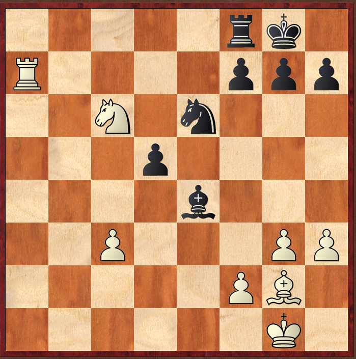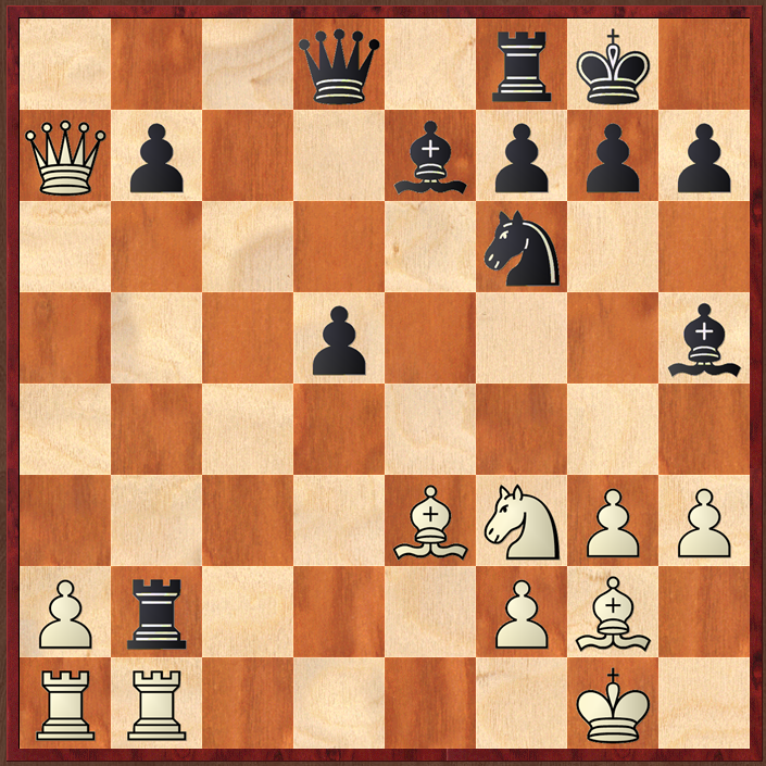 Black (Maxime Vachier-Lagrave) has just played Rac8, to which Mickey replied Bc1-e3. I think I would play, almost without thinking, c3, protecting my c pawn, but I do realise that my queen might be pushed somewhere: and also, I would only be protecting the c pawn as a knee-jerk reaction “it is threatened, therefore I defend it” whereas I know I should (following one of Purdy's maxims) always ignore the threat, and decide what I would like to do irrespective of the threat, and then decide if the threat must be met.