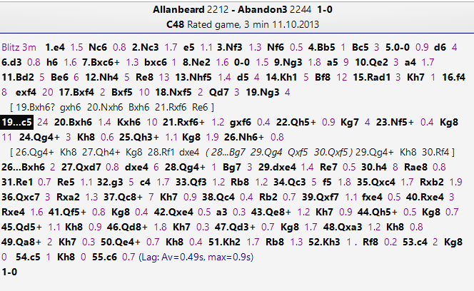 The puzzle is from a 3 minute Playchess.com blitz game yesterday. I was pleased to see that 1 Bh6! might be strong, with the g7 pawn being tied to the defence of the Nf6, so that 1…Kh6 is forced, when 2 Rf6! shatters open the king's defence, and it is more or less intuitive that white will have a perpetual. After a quick glance for something else rather than 1 Bh6, I realised that after 2 Rf6! the queen is LPDO, and then I saw checking until the queen gets to g4 or h3 must give a discovered check possibility. And this is how the game panned out, and I am pleased to say that Houdini didn't wreck the concept.