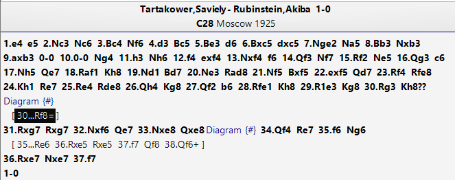 It is fairly easy to get to this position in one's mind- after 2 Nf6, Q somewhere, 3 Ne8 Qe8, but then what? My first thought, harking to the pin on the e-file and Alekhin's gun, was 4 Qe3, which gives some advantage, as does 4 d4, but then I saw 4 Qf4! which is far stronger in the critical line. 4…Re7 [] 5 f6 Re6[] 6 Re5! Re5 [] 7 f7! and Qf6+ is terminal, whether or not black inserts Re1+.