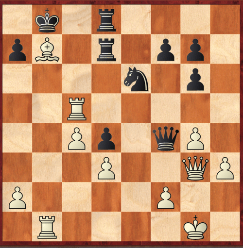 The diagrams below show some of the positions, starting with the line I chose as my 'solution' before looking at the answer. I decided upon 1 Re6, reasoning that white might have something in the ending, my main line being 1…Qg3 2 fg fe 3 g5 Rf8 4 Be4 Rf7 5 Rb2 when white picks up the g6 pawn, and will then advance his g and h pawns. From my analysis on the board, I couldn't see a way black could get his rooks it the game.