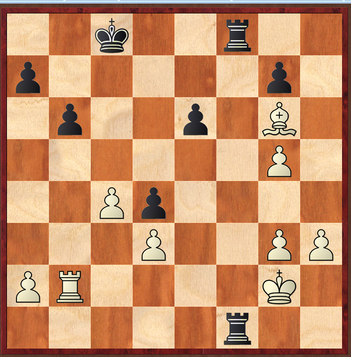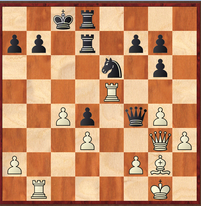 The diagrams below show some of the positions, starting with the line I chose as my 'solution' before looking at the answer. I decided upon 1 Re6, reasoning that white might have something in the ending, my main line being 1…Qg3 2 fg fe 3 g5 Rf8 4 Be4 Rf7 5 Rb2 when white picks up the g6 pawn, and will then advance his g and h pawns. From my analysis on the board, I couldn't see a way black could get his rooks it the game.