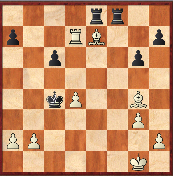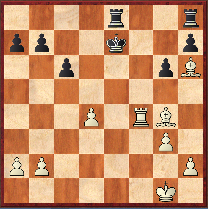 What to do next took me a while: Rb7 is natural, but looks insufficient for a problem: and at first 2 Bf5 didn't seem good enough. Then I saw the 'mating' line, and knew that I had honed in on the solution. But first, black could always 'chicken out' and play 1…Kd7 instead, when I thought the game would just 'go on', but Houdini tells me that white's advantage is overwhelming after Bg7 biffing the rook, and then Bd3 removing the bishop from harm's way. Still, Houdini's +5 advantage in the position below does seem odd to me, though doubtless if I were to do what I should but never will, and play some training games starting from this position, then I would begin to appreciate the assessment.