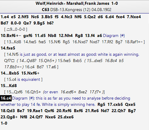 I had never heard of Heinrich Wolf before: his Wikipedia entry shows he is a virtual near contemporary of Marshall's, against whom he had a positive score.