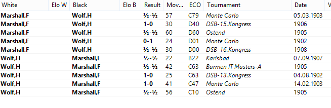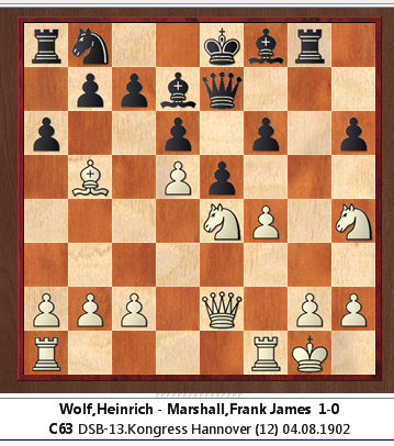 I had never heard of Heinrich Wolf before: his Wikipedia entry shows he is a virtual near contemporary of Marshall's, against whom he had a positive score.