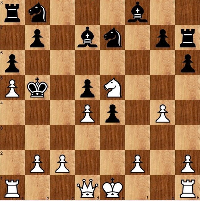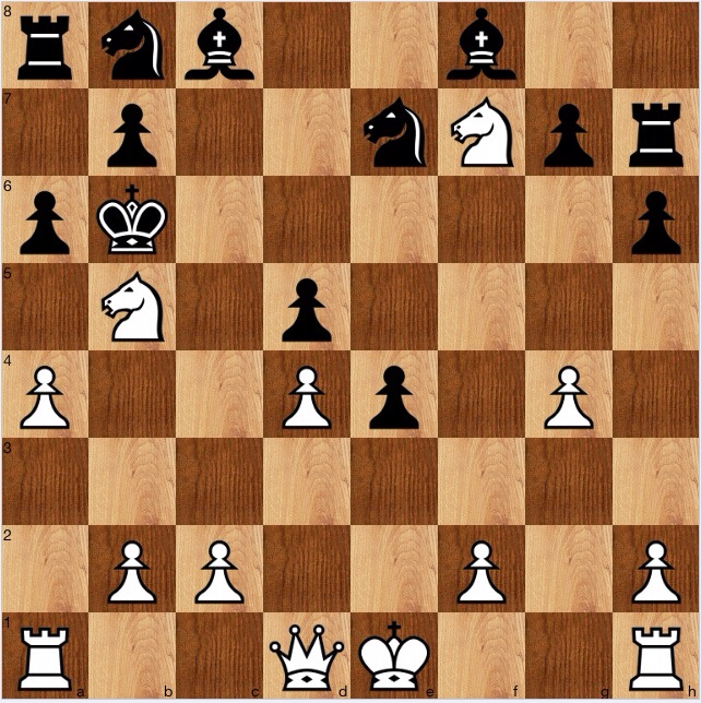 Reitstein asks the reader to find the most effective way to terminate the king hunt, and 1 a5+ is more or less obvious. (If it weren't, following Purdy's axioms would lead to it: examine all checks)). If..1…Kc6 then 2 Ne5+ when 2…Kb5 is forced, so it it clear that 1…Kb5 is the best try, but 2 Ne5! anyway, and 3c4+/4 Qa4+ follows.